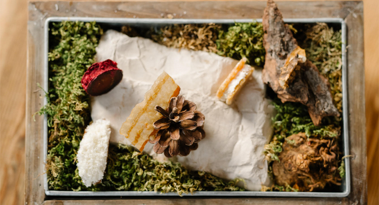 Un pre-dessert riporta alla quiete delle cime dove la natura ha il sopravvento sull’uomo: è la “Perla delle Dolomiti”, con gelato al pino mugo e crema di abete guarnita con crumble di nocciole e mandorle.