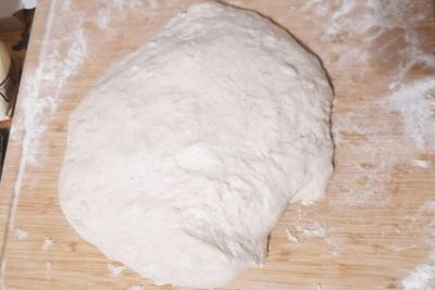 • Il mattino seguente (attorno alle 8) l'impasto sarà raddoppiato. Gli do la forma desiderata (in questa fase si sgonfierà in parte), con un coltello affilato procedo con un paio di tagli in superficie e lo pongo per altre 3 ore circa sulla piastra individuata per la cottura, debitamente infarinata.