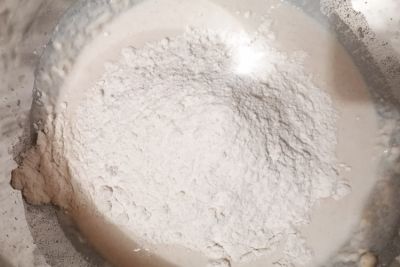 Rinfresco del licoli• Alle 20 impasto il pane. In una capiente ciotola sciolgo 200 g di licoli (il restante lo ripongo in frigo nel suo contenitore ermetico) in 250 g di acqua. Aggiungo 15 g di sale e mescolo fino fino al suo scioglimento. A questo punto si può aggiungere anche qualche spezia (per esempio la curcuma, ma non più di un cucchiaio). Incorporo la farina, do una veloce mescolata con un cucchiaio e poi impasto a mano per almeno 5 minuti.