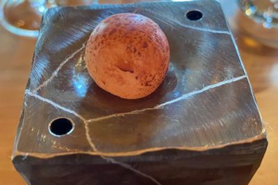Dopo un gradevole consommé di zucchine con una gelatina di spezie orientali si riparte con: pane di segale di Eugenio Pol, “il Vulaiga” panettiere di Fobello, con un olio di Pinerolo e due tipi di crema di burro di Bagnolo Piemonte, di cui una affumicata