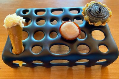 Maiale nero del Piemonte con mais croccante e polpettina di quinto quarto oppure tartelletta con sfilacciata e spuma di zabaione salatoE infine i dessert, a cura di Beatrice Casella: si inizia con una ricostruzione del Petit Beurre di Nantes, dolce dalla storia e dal significato affascinanti (4 lati come le stagioni, 52 dentini come le settimane dell’anno, 24 forellini come le ore del giorno) con confettura di amarene;