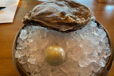 Ma è giunta l’ora di lasciare spazio alla spiegazione dei piatti il cui assaggio ci accompagnerà per circa 2 ore. Si inizia con un aperitivo di benvenuto con chips di foglie di carote e fiore di riso al pomodoro e un brindisi con Champagne Jacquesson 744; e poi a seguire: conetto di noci e parmigiano, un omaggio al peperoncino piemontese, una tartelletta di pollo con alga nori e mela verde, una miaccia con paletta biellese servita su una mini torre di acciaio corten simbolo di Gattinara realizzata dall’artista locale Ruben Bertoldo; e poi ancora asparagi violetti saltati in padella con crema di uovo fritto con fragole verdi e fragole grattugiate, un’ostrica marinata e richiusa con azoto liquido, zucchina in fiore fritta e ripiena di seirass, zucchina novella ripiena di gambero rosa crudo di Sanremo.