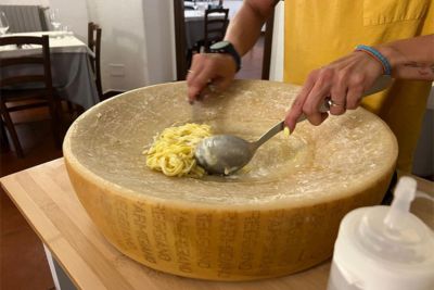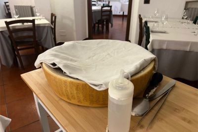 Ma il piatto che resta più impresso, anche per la concessione allo spettacolo dell'esecuzione al tavolo, è senza dubbio la ruota di Reggiano 24 mesi, spaghetto alla chitarra, dove lo spaghetto viene mantecato direttamente nella forma del formaggio: scenografico certo, ma soprattutto, abbondante e assai gratificante al palato (prezzo medio primi 13/18 euro). Più che un richiamo turistico, questo è un piatto di autentica sostanza.