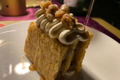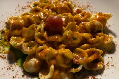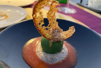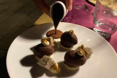Ed ora i dolci: noci, fave di Tonka e ristretto al Primitivo “Bruno” (10 euro), la millefoglie di gianduja (12 euro) con ganache alla vaniglia Tahiti e arachidi salate (wow!), accanto a gelati e sorbetti e al viaggio esotico. Molti dei piatti assaggiati facevano anche parte dei menu degustazione: “Vespa incontra la Puglia” a 75 euro e “Vista mare” a 90 euro. Anche qui i prezzi sono allineati a quelli dei vini: un ottimo equilibrio che nell’insieme offre soddisfazione a chi vive questa esperienza. I giovani che compongono la squadra, in sala e in cucina, sono bravi, premurosi, attenti, e capisci che stanno vivendo una bella sfida che è già un regalo per tutta la zona.
