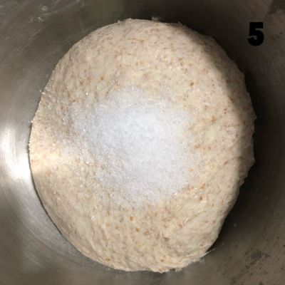 • sciogliere 2g di lievito in 50g di acqua (65% idro) inserirla nell’impasto e continuare a lavorare (foto 4)