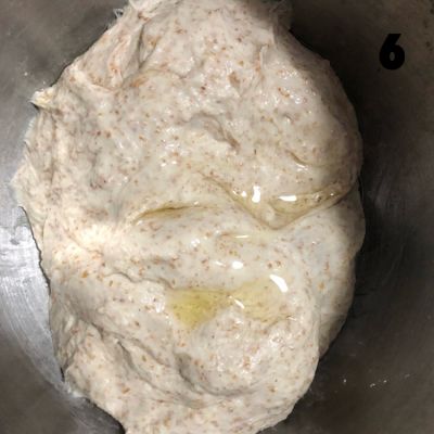 • assorbita l’acqua aggiungere l’olio e lavorare l’impasto fino al suo assorbimento (foto 2)
