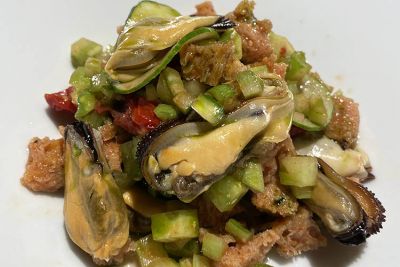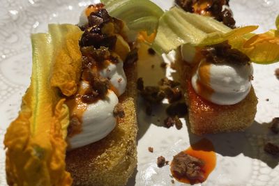 Golosa la polenta gialla, robiola e olive nere, ricercata la panzanella di cozza Mitilla, irrinunciabile la lingua, uovo e zucchine scapece.