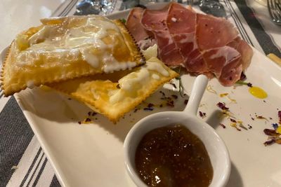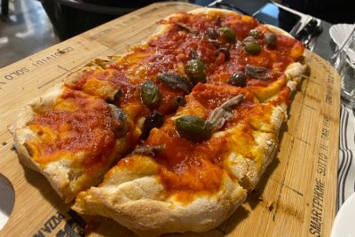 Ed eccoci al trionfo delle pizze con utilizzo di lievito madre e farina origine (dai 9 ai 10 euro). Una decina le proposte, tra le quali l’ottima “Capperina” con sugo di pomodoro, capperi, olive taggiasche e acciughe, la “Piccantina” con spianata calabrese, ed ancora la “Cipollotta” con bufala campana, certosa, cipolla caramellata al balsamico e peperoncini gialli dolci peruviani, e la “Friariellina” con mozzarella julienne, salsiccia e friarielli. Apprezzata anche la derivazione sul tema che abbiamo ordinato, ovvero “Recco e dintorni”, croccanti focaccette al formaggio in sfoglia servite con culaccia di Langhirano e crema di fichi (€ 12).