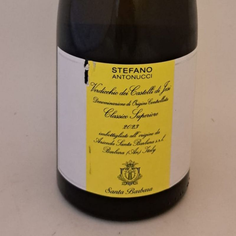 È il Verdicchio dei Castelli di Jesi Classico Superiore “Stefano Antonucci” 2023 della cantina Santa Barbara di Barbara (An). Ha un colore paglierino e un naso complesso che si apre poco a poco, profondo, minerale e con cenni di incenso. In bocca è pieno, con una trama setosa e un finale acido e amarognolo.
