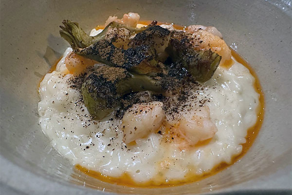 È al ristorante AL di Torino, nelle cucine del giovane Alberto Fruttero, allievo di Davide Oldani. Siamo nella zona delle ex officine Docks Dora in un locale open space invitante con due menu degustazione da 4 e 8 portate. Per noi un superbo risotto, carciofi e gamberi; faraona/borraggine/patate/miso di segale e la sua interpretazione di tarte tatin e madeleine. Leggere la recensione su IlGolosario.it.