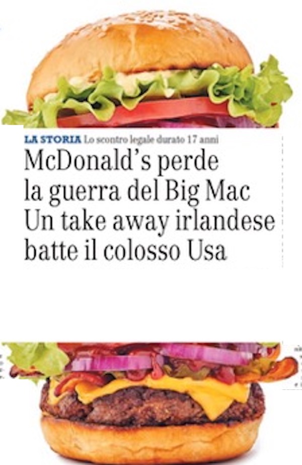 McDonald's perde l'esclusiva del Big Mac. Un take away irlandese, Supermac's, dopo una battaglia legale durata 17 anni e arrivata davanti alla Corte di Giustizia Ue, ottiene la possibilità di usare lo stesso nome per il panino al pollo. La multinazionale infatti non ha potuto dimostrare l'uso per cinque anni consecutivi del nome legato a prodotti a base di pollame. (IlGiornale) @ E in tema di grandi marchi, Nutella diventa anche gelato. Il nuovo prodotto Ferrero nasce per colmare il gap estivo quando la celebre crema non viene prodotta per via delle temperature calde. (IlGiornale) @ Una piattaforma a regia unica per le fiere italiane all'estero. La proposta è stata lanciata dal presidente dell'Aefi, associazione nazionale di riferimento, Maurizio Danese. Secondo l'ultimo rapporto Prometeia-Aefi il fatturato per le aziende appartenenti ai tre macrosettori più rappresentativi (agroalimentare, tecnologia e edilizia/arredo) che si sono affacciate alle Fiere internazionali negli ultimi dieci anni è quasi raddoppiato. (Italia Oggi) @ Il segretario nazionale delle Nazioni Unite Guterres, in occasione della giornata mondiale dell’ambiente, lancia l’allarme per il caldo record registrato nell’ultimo anno. Non si riscontrano inversioni di tendenza nonostante gli sforzi e gli accordi di Parigi e si pensa a un aumento delle tasse sui combustibili fossili (laRepubblica) @ In Italia la crisi dei negozi è sempre più nera: nei primi tre mesi del 2024 sono scomparse circa 10mila imprese al dettaglio: quattro ogni ora. Per la precisione 9.828 a fronte di 7.415 nuove aperture. In compenso lievitano i negozi on line. (Italia Oggi)