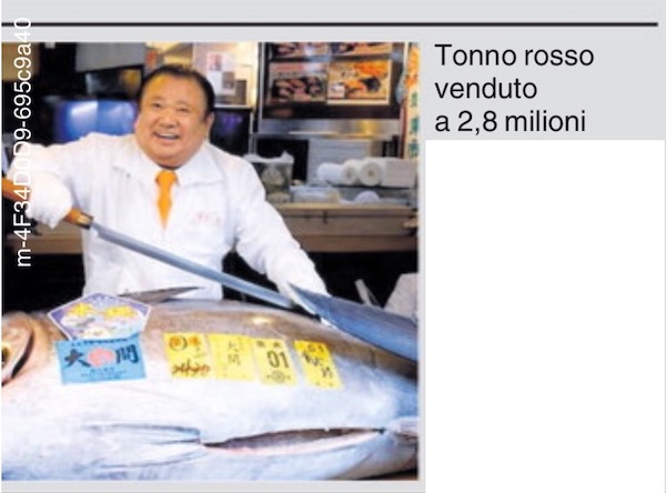Nuovo tonno da record all’asta del pesce di inizio anno al mercato di Tokyo. Un esemplare di 243 chili pescato al largo di Oma ha raggiunto la cifra di 2,8 milioni di euro. (Il Giornale)
