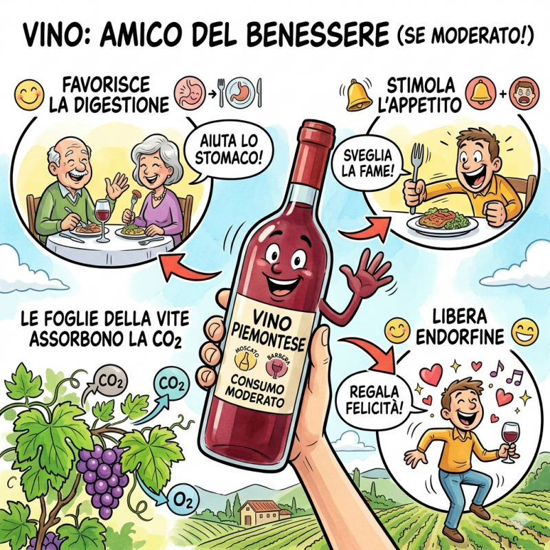 Il vino, bevanda antica 15mila anni, se consumato in dosi moderate favorisce la digestione, stimola l'appetito negli anziani e libera endorfine. Oltre alle proprietà terapeutiche contro il raffreddore (come nel caso del Vin Brulè), la vite vanta curiosità storiche, come i rami usati da Spartaco per fuggire dal Vesuvio, e ambientali, grazie alla capacità delle foglie di purificare l'aria assorbendo CO2 . (Ciro Vestita su QN del 4 aprile)