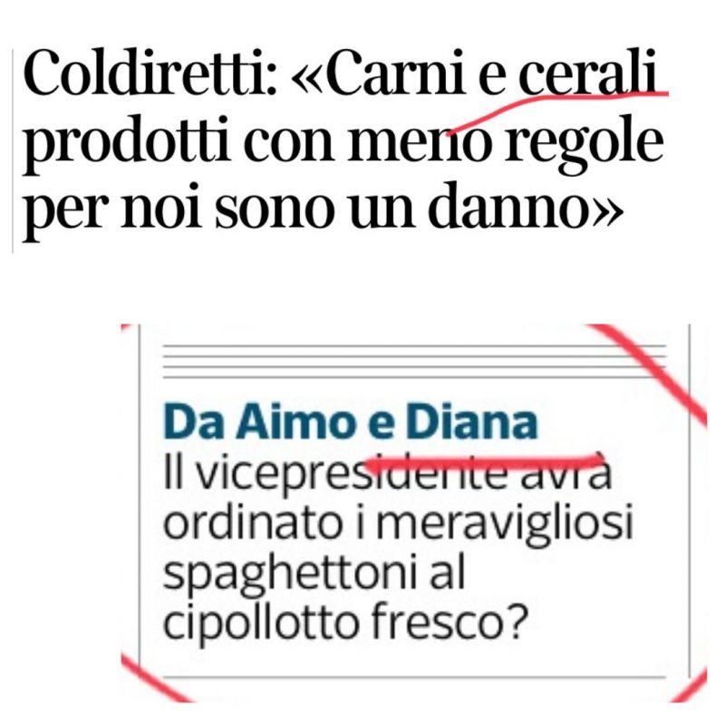Continua la caccia all’errore sui giornali, questa volta tutti e due su IlCorriere della Sera. Se il primo potrebbe essere una svista “Carni e CERALI” sull’edizione veronese; il secondo è clamoroso (e forse frutto di una correzione con AI?): “Aimo e Diana” famoso locale a Milano che fa gli spaghetti al cipollotto (Ma il nome giusto è AIMO E NADIA dai!)