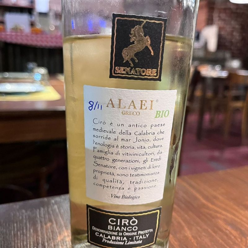 È il Cirò Bianco "Alaei" 2024 delle Cantine Senatore di Cirò Marina (KR). Di colore paglierino chiaro, ha naso di cedro ed erbe aromatiche. In bocca è fresco con una bella sapidità.