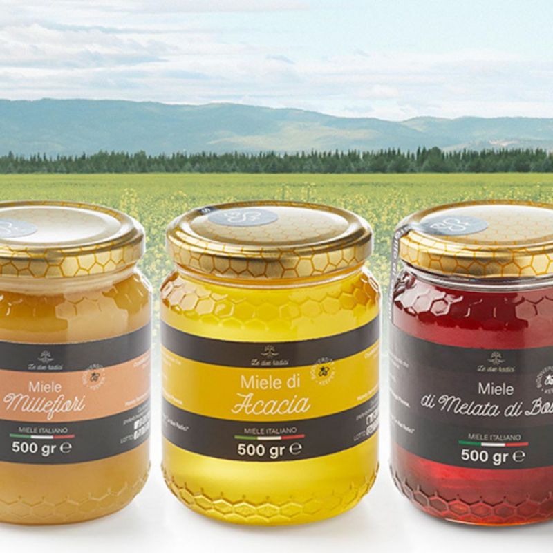 Sono i mieli di Le Due Radici di Montecalvo Versiggia (fraz Crocetta, 13 - PV) dove Luca Bongiorni cura le sue 120 arnie, praticando anche il nomadismo delle api sulle vette montane. Nasce così una gamma di mieli interessante tra cui il Ruchetta Violacea, ottenuto da un fiore tipico del territorio che nasce ad anni alterni tra i filari dei vigneti, il castagno, il tarassaco, il millefiori; non mancano la pappa reale, il polline e i propoli.
