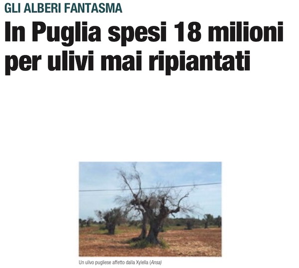 In Puglia spesi 18 milioni per ulivi mai ripiantati: molti dei fondi concessi alle aziende colpite dalla Xylella sarebbero finiti tra il 2016 e il 2022 ad aziende chiuse o con titolari deceduti, stando alle verifiche effettuate da AGEA, l’Agenzia nazionale per le erogazioni in agricoltura. (Libero)
