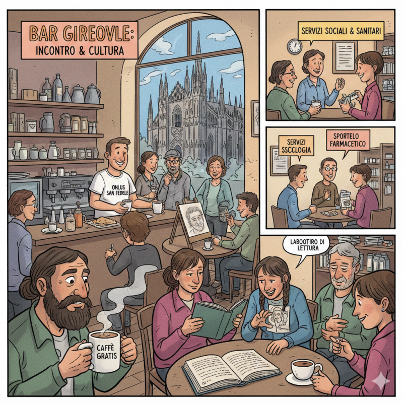 A Milano, a pochi passi dal Duomo, il bar "Girevole" trasforma un'ex vineria in un centro di aggregazione per le persone senza fissa dimora. L'iniziativa, promossa dalla onlus San Fedele, offre caffè gratuito, attività culturali e laboratori di lettura, puntando sulla convivialità anziché sull'assistenza. Lo spazio permette inoltre a educatori e psicologi di intercettare i bisogni degli ospiti in un contesto informale, integrandosi con i servizi sanitari e farmaceutici che l'associazione garantisce ai più fragili nel cuore della città. (Libero)