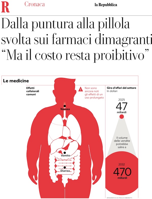 Ampio spazio all’alimentazione e all’obesità. Interessante l’intervento di Margherita De Pac sul Corriere della Sera la quale afferma che la legge italiana che riconosce l’obesità come una malattia stia facendo scuola in Europa e nel mondo. Il provvedimento segna un cambio di approccio passando dal giudizio alla cura. @ Intanto si preparano ad arrivare in Europa le pillole antiobesità. NovoNordisk e Eli Laly verranno presto autorizzate a vendere i loro prodotti sotto forma di pastiglie: dopo il via libera della FDA Americana sarà la volta dell’Europa aprendo un potenziale mercato da 470 miliardi di dollari (secondo le previsioni al 2032). (Repubblica) @ La cattiva nutrizione, al di là delle “pillole”, è un problema sempre più ampio, soprattutto tra i più piccoli. Secondo Unicef i minori obesi nel mondo sono 188 milioni superando per la prima volta il numero di chi è sottopeso. Questo, spiega Antonella Barina su Il Venerdì, non significa che stiamo sconfiggendo la fame ma che stiamo diffondendo la malnutrizione. I tassi di obesità giovanile in 25 anni sono cresciuti dal 3 al 9,4%. @ Sui nostri scaffali invece si vanno diffondendo sempre più i prodotti “high protein” che però, al di fuori di una dieta sana, possono essere nocivi. Il consiglio della nutrizionista Sabrina Coen su IlVenerdì di Repubblica. @ Riconosciuto dal MASAF il Consorzio Nazionale Grappa. Si tratta del primo organismo di tutela per una bevanda spiritosa italiana a Indicazione Geografica. Il riconoscimento arriva in un momento di particolare dinamismo per il settore. Nei primi sette mesi del 2025, le esportazioni di Grappa, pur rappresentando una quota di nicchia del comparto, circa 19 milioni di euro, confermano il suo ruolo identitario nel panorama produttivo nazionale registrando, contestualmente, una variazione positiva a volumi (+2%).@ Le pale dei fichi d’India siciliani possono diventare l’ingrediente di gel e disidratanti naturali ed essere utilizzatidall’industria alimentare, cosmetica e farmaceutica. Ne parla Alessandro Gassman su Il Venerdì raccontando il progetto di Opuntia Italia. @ Le specialità Babbi arrivano in Medio Oriente: l’azienda romagnola ha infatti aperto una filiale a Dubai. E domenica a Golosaria premierà le migliori gelaterie de IlGolosario (QN).